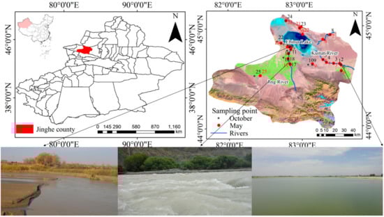 - In total, this study collected 47 water sampling points, with 23 points collected in May 2015 and 24 points collected in October 2015. The samples were taken in a wide range of hydrological environments in May and October, which included the Kuitun and Jing River (P1, P2, P3, P4, P5, P6, P11, P13 (just in October), P14, P15, P16, P17, P18, P19, P20), the ditches of these rivers (P9, P10), and Ebinur Lake (P7, P8, P21, P22, P23, P24, P25). The surrounding land-use/cover types of the inflowing rivers contained farmland, forest–grassland and others, while that of the ditches contained salinized land and farmland, as well as others. Thus, these sampling points were collected mainly out of concern for the effects of different land-use/cover types on the surrounding surface water. Besides, the river water flows into Ebinur Lake and affects its water quality. It is not certain whether the inflowing rivers and surrounding land-use/cover types affect the water quality of the lake. Thus, it is necessary to take water from the inflowing rivers and its ditches as well as from Ebinur Lake itself. The information about the land-use/cover types within the one-km buffer zone of the water quality sampling points in the research area was obtained. The sampling points from the inflowing rivers were used to test the monitoring indices, including: chemical oxygen demand (COD), five-day biological oxygen demand (BOD5), suspended solids (SS), total phosphorus (TP), total nitrogen (TN), ammonia nitrogen (NH3-N), chromaticity (SD), and turbidity (NUT). The pillar industries in the Jinghe Oasis include salt production and Artemia breeding. Non-heavy industry is present; thus, point source pollution from industrial wastewater was not considered in the research zone. All of the polyethylene bottles were used to store the samples. The bottles were cleaned, dried, and sealed with deionized water before sampling. The samples were taken to the laboratory for measurements and analyses after collection. We applied dichromate titration, dilution, inoculation, gravimetry, ammonium molybdate spectrophotometry, alkaline potassium persulfate decomposition UV spectrophotometry, and Nessler’s reagent spectrophotometry to measure the COD, BOD5, SS, TP, TN, and NH3-N, respectively. The analyses of all of the samples were entrusted to and completed by Urumqi Jincheng Measurement Technology Co., Ltd. (Urumqi, China). Research samples were collected from agricultural land in Jinghe County and Tuotuo Village, which surround Ebinur Lake; a national ecological zone in Ebinur Lake called Bird Isle; and the Ganjia Lake Haloxylon natural conservation area.