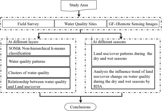 The main objectives of this study were to: (1) analyze the spatial framework of water quality using the self-organizing map (SOM) method, based on non-hierarchical k-means classification; (2) explore the relationship between the water quality parameters and land-use/cover types in different clusters; and (3) analyze the relationship between water quality parameters and land-use/cover types in different stages.