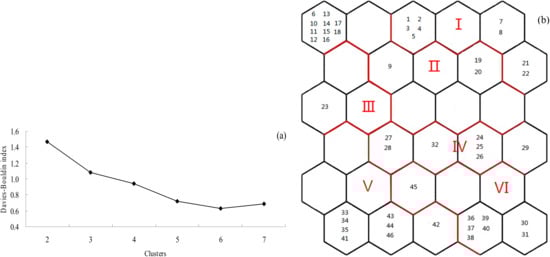 When the average variance values are less than 5% for different clusters, the DBI is low; thus, the corresponding clustering number can be regarded as the best clustering result. Therefore, this study input the trained weights of the neuron nodes through the K-means cluster analysis, which combined with the DBI to select the clustering number. The results are shown in Figure 3a. Six clusters were formed because this number yielded the minimum DBI value (Figure 3a).