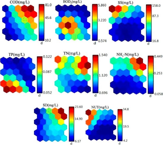 Figure 4 describes the distribution of different water quality parameters on the SOM. High COD, TN, NH3-N, and SD values were recorded in the right corner of the SOM network, thereby indicating a declining trend in the southern Ebinur Lake region and the surrounding Kuitun River. The right corner of the SOM locates this trend in Clusters 4 to 6 in May 2015, and the left corner locates this trend in Cluster 1 to 3 in October 2015 (Figure 3b). The values during the wet season (May 2015) were higher than those during the dry season. High values of SS and NUT were observed in the left corner of the SOM network, which falls within the scope of the agricultural ditch and the Jing River areas during the dry season; thus, these are increasing trends. This region is mainly distributed around the agricultural land area and is significantly influenced by human activities. High TP values were observed within the scope of the lower left corner, which mainly focuses on the agricultural ditch and Jing River during the dry season. Crops were mature during the dry season (October 2015), and the farmland area was increased, which thereby increased the TP value. In contrast, the distribution of the BOD5 was different, indicating a declining trend from the center to the surrounding area. High BOD5 values were mainly observed downstream of the Ganjia Lake Haloxylon natural conservation zone, which is surrounded by a salt field, thereby exerting a certain influence on the surrounding water quality. The regional change in the water quality of the Jinghe Oasis was reflected clearly and directly through the SOM. During the wet season (May) in the Jinghe Oasis, melted water from mountain ice and snow promote the flow in the Jing River, thereby resulting in a significant increase in surface runoff, leading to an improved water quality in the rainy season compared with the dry season (Figure 4). To observe the distribution of the water quality parameters directly, we collected different values of the water quality parameters at various layers (Figure 5).