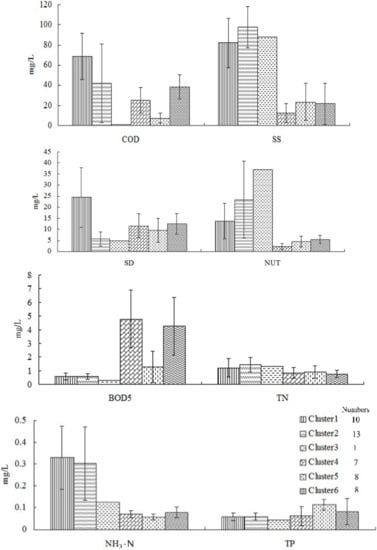 As shown in Table 1, according to the Chinese Environmental Quality Standards for Surface Water (GB 3838-2002), Clusters 1 to 6 did not satisfy the potable water quality level. Clusters 1 and 2 had an identical water quality classification level, and their COD and TN contents were higher than the standard values. The COD content exceeded level V. Meanwhile, the BOD5 and COD contents were excessive in Clusters 4 and 5, respectively. In Cluster 6, both the COD and BOD5 contents were excessive, but the COD content was higher.