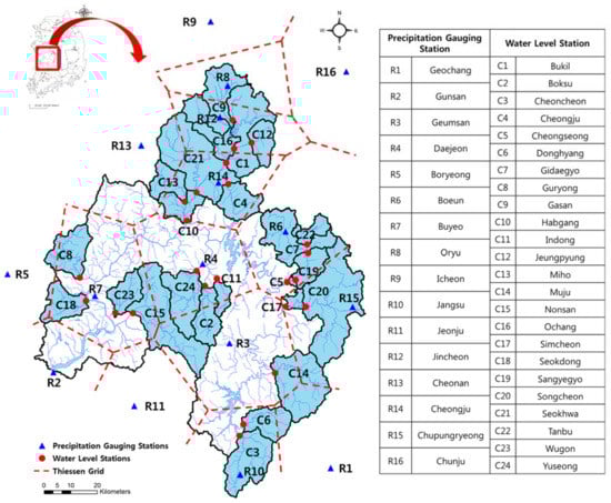 Hydrological data (rainfall, flow and climatic data) were obtained from the Water Resources Management Information System [22] and the Hydrological Investigation Report of Korea [19]. The rainfall data were provided by the Korea Meteorological Agency (KMA). As shown in Figure 1, 16 rain gauges operated by the KMA are used to produce catchment average rainfall on an hourly time-step with the Thiessen polygon method. The potential evapotranspiration data were estimated by using the metrological data of the nearest weather station to study catchment with the FAO Penman-Monteith method, developed by the Food and Agriculture Organization of the United Nations [21,23].