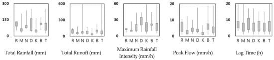 Box plot of the flood characteristics of the 113 flood events (Boxes are 25% and 75% quantiles, R = Rusa, M = Maemi, N = Nari, D = Dianmu, K = Kompasu, B = Bolaven, T = Total).