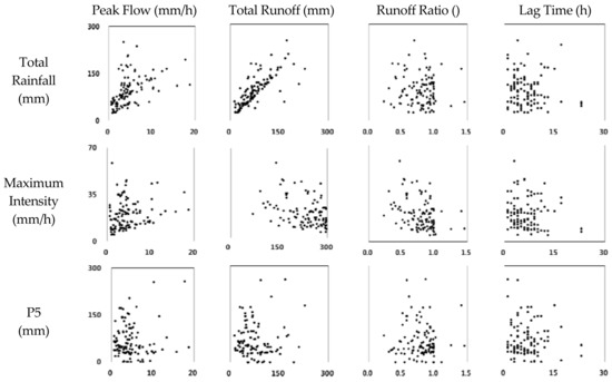The characteristics of each typhoon flood event are summarized as: total amounts of rainfall and runoff; maximum rainfall intensity; peak flow; lag time between rainfall and runoff peaks; rainfall duration; and antecedent rainfall over the 5 days preceding the event. Figure 2 shows box plots of the first 5 of these characteristics, showing the maxima and minima, and 25% and 75% quantiles. As shown in Figure 2, the flood characteristics vary widely within each typhoon (i.e., between catchments).