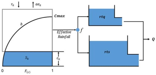 The PDM (Probability Distributed Moisture) model is a lumped conceptual rainfall runoff model, which has been used as the main rainfall-runoff model in UK flood estimation procedures [25] and has been proposed as suitable for Korean flood estimation [26,27]. The version of the PDM developed by [25], illustrate schematically in Figure 4, is used here. The details of the PDM model structure are described in [28] and only a summary is provided here.