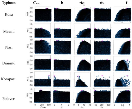 A separate PDM MP set was calibrated for all 113 events with sufficient observed data, in order to examine differences between them. The results for the 6 flood events at the C4 (Cheongju) catchment are presented here as an example. Figure 5 shows the scatter plots of MP value versus NSE obtained from the Uniform Random Search. Optimal values of rtq and f are relatively identifiable, whereas optimal values for rts are relatively non-identifiable, with c and b having intermediate identifiability. Figure 5 shows that, even for the more identifiable MPs, the optimum values are different across typhoons. A similar result is observed for the other gauges.