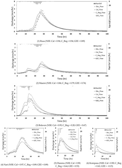 The regression equations in Table 7 are applied to catchment C4 as an example. The estimated MPs are shown in Table 8, and Figure 7 shows the predicted hydrographs. The hydrographs at Kompasu and Bolaven are not considered acceptable in terms of volumes and peaks, indicating that MP estimates are not applicable to all flood events. The result at Dianmu is better than the calibrated model in terms of peak flow, at the expense of volume performance.