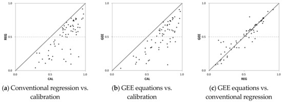 The results of cross validation are shown in Figure 8. The selected CCs for each MP are the same CCs shown in Table 7 and Table 9. The results for the conventional regression and GEEs are compared with the locally calibrated model results for each typhoon flood event. In Figure 8a,b, if the points are located on the 45-degree line, the performances using regionalization are the same as those of calibration; whereas if the points are located above the 45-degree line, the performances using regionalization are better than those using the calibrated model. The calibration results are better than both regionalization approaches. The results of the two regionalization methods are compared in Figure 8c). The performances using the two methods are similar. This indicates that there is no practical benefit adopting the more complex GEE method, although there may be scope for refining its specification, in particular the link function and correlation structure. Furthermore, in this study we did not incorporate error models in order to estimate confidence intervals on predictions, and these may be more successful using the GEE approach.