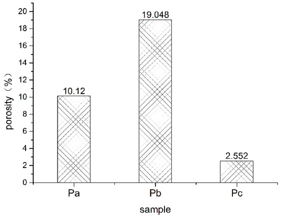 Figure 1. Average porosity of oil shale heated to different temperatures (Pa, Pb, Pc, respectively, represent oil shale heated to 300 °C, oil shale heated to 500 °C, and unheated oil shale).