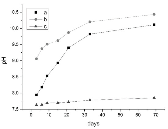 Figure 3. Change in pH over immersion time (a, b, and c, respectively, represent the pH of the liquids with oil shale heated to 300 °C, oil shale heated to 500 °C, and unheated oil shale).