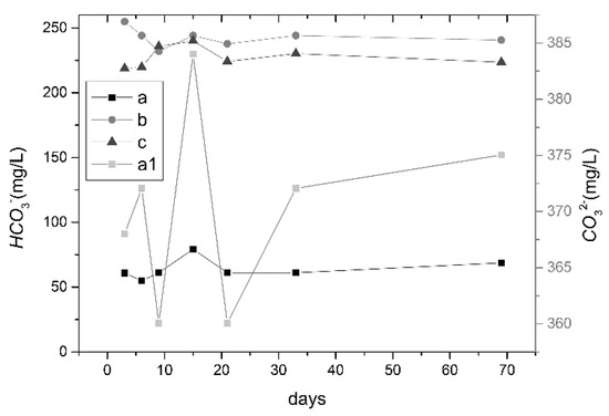 Figure 4. Concentration curves of CO32− and HCO3 contents in sample liquids (a, b, and c, respectively, represent HCO3 content of liquids with oil shale heated to 300 °C, oil shale heated to 500 °C, and unheated oil shale; a1 represents the CO32− content of liquids with oil shale heated to 300 °C).