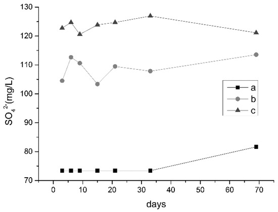Figure 8. SO42− concentration curves of sample liquids (a, b, c, respectively, represent liquids with oil shale heated to 300 °C, oil shale heated to 500 °C, and unheated oil shale).