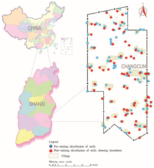 Shanxi Province, a significant coal industry base in China, has afforded coal output of more than 10 billion metric tons for national economic development since the founding of the People’s Republic of China, and has contributed greatly to national energy security. However, Shanxi Province lies on the ecologically vulnerable Loess Plateau; thus, serious ecological and environmental problems arise out of the mass extensive and intensive coal exploitation, with destruction of watery environments and a huge impact on shallow groundwater [1,2,3]. Following coal extraction, there are three distinct zones of movement and hydrological responses in the overburden rock mass above the mined area in the vertical section: caved zone, fracture zone, and continuous deformation zone [4,5,6,7,8]. The fissures (voids) in the former two zones interconnect with mine workings, forming water flow channels. Therefore, the fracture zone together with the caved zone has been defined as a fractured water-conducting zone [9,10], of which maximum height is often expressed and estimated as a function of the mining height in China [8,9,10,11]. It is generally known that, in a shallow coalfield, the fractured water-conducting zone intersects the overlying Quaternary aquifers, providing unhindered passageways for groundwater flow into the mining area. The hydraulic connection not only seriously threatens mine safety, but also leads to groundwater recession, which could destroy vegetation and cause wells to dry up, so that affected locals would need to look for alternative water supplies [2,6,12,13].