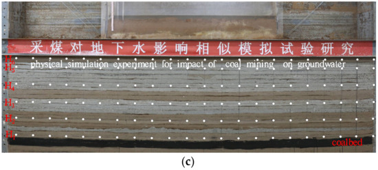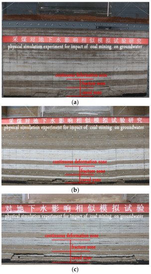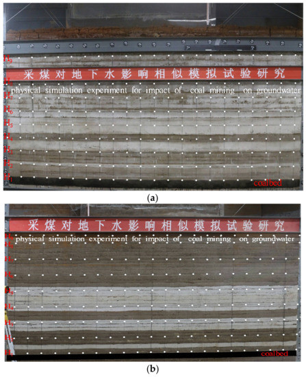 A physical simulation experiment is an effective method for observing the overburden failure directly and is widely applied [26]. The quantitative or qualitative movement and deformation of overlying strata rooted in underground mining have been successfully simulated [9]. The experiments were designed to directly show the complex impact of deep underground mining on groundwater.