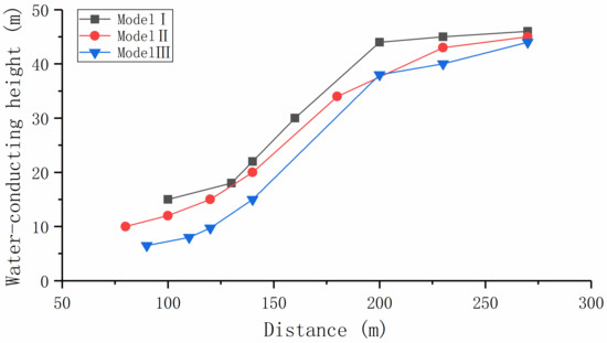 The study on the distribution of mining fractures in rock masses is not only related to coal mine safety, but also to the protection of groundwater resources [23,30,31]. Fractures developed throughout the whole excavation and continued for a limited period after mining [32]. As the mine face advances, the caving fissures in the roof gradually grow from the bottom to the top, forming an “upward crack zone”, also known as a fractured water-conducting zone [33], which is the most interesting region to mining engineers. It is vital to accurately determine its height because complete groundwater drainage occurs here, and the post-mining and pre-mining hydraulic conductivities (K) are different [16,34,35], which can lead to rapid groundwater inrush into the working face. The bending deflection downward of roof strata above the mined-out area is being aggravated with the enlarging excavation scope, resulting in greater odds of failure. The developing height and range of the water-conducting zone thus grew gradually in a stepwise manner and tended to increase gently after the working face advanced to a certain distance. This is because the bearing capacity of the caving rock increases as collapsed rock fills the gob, accumulating and compacting continuously. Under the same geological conditions, mining thickness, and exploitation method, the deeper coal seam, the greater overburden pressure and the larger overburden movement scale resulted in a more developed fractured water-conducting zone. In other words, the height of the fractured water-conducting zone was directly related to the void width and the overburden thickness. During coal mining, the height variation of the fractured water-conducting zone with the distance advanced by the face is shown in Figure 5. The peak heights were approximately 15 times the seam thickness, which were approximately 46 m, 45 m, and 44 m for Model I, Model II and Model III, respectively. There was no significant difference between the models of different heights.
