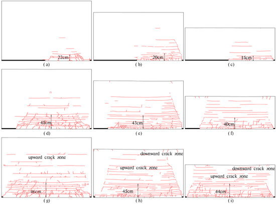 Schematics of fissure development. (a) Workface advanced 140 m in Model I; (b) Workface advanced 140 m in Model II; (c) Workface advanced 140 m in Model III; (d) Workface advanced 230 m in Model I; (e) Workface advanced 230 m in Model II; (f) Workface advanced 230 m in Model III; (g) Workface advanced 270 m in Model I; (h) Workface advanced 270 m in Model II; (i) Workface advanced 270 m in Model III.