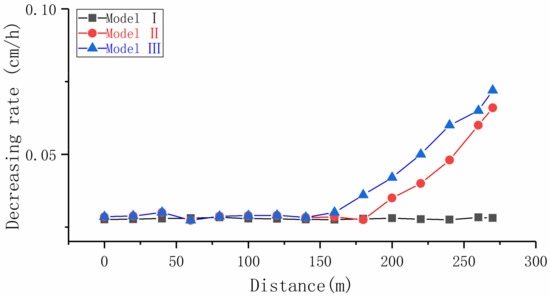 The change in the water level during mining in the overlying unconsolidated aquifer, corresponding to various overburden heights, is shown in Figure 7. For Model I, the rate of descent of the water was consistent with pre-mining over time; the unconsolidated aquifer was not affected by mining. For Model II, the rate of descent was relatively stable in the process of the working face advancing to 180 m. Thereafter, the water level dropped rapidly and the rate of decrease was 0.066 cm/h at the end of mining. For Model III with minimum overburden thickness, similar to Model II, the water level decline remained steady during the working face advancing to 160 m, and then gradually accelerated and finally reached 0.072 cm/h. Exploitation at various depths had different effects on the overlying unconsolidated aquifer.