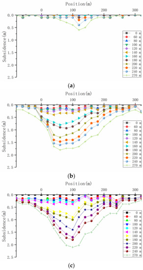 The ground movement and the deformation take two main forms: Horizontal and vertical, both of which affect the overburden stability and the permeability of the post-mining. The clay aquitard beneath the unconsolidated aquifer is located at the top of the overburden, which belongs to the continuous deformation (bending) zone. Its stability is the key to the loss of groundwater from the porous aquifer. Therefore, this provided a theoretical basis for revealing the mechanism of the groundwater depletion with respect to the failure and the deformation features of the aquitard (silty clay stratum) under mining conditions. According to the measured data from the top monitoring lines, subsidence change curves were plotted for different mining depths, as shown in Figure 9.
