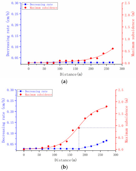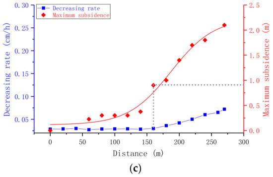 We denote the thickness of bedrock in continuous bending as Hb. The changes in the rate of decline of the water table in an unconsolidated aquifer are related to Hb. The Hb values for the three models were 140.9 m, 106.2 m, and 58.6 m, respectively; the relationship between the thickness and the water table drawdown is shown in Figure 8.