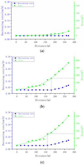Relationship between the subsidence-bending area of the aquitard and the rate of decline of the water level: (a) Model I; (b) Model II; and (c) Model III.