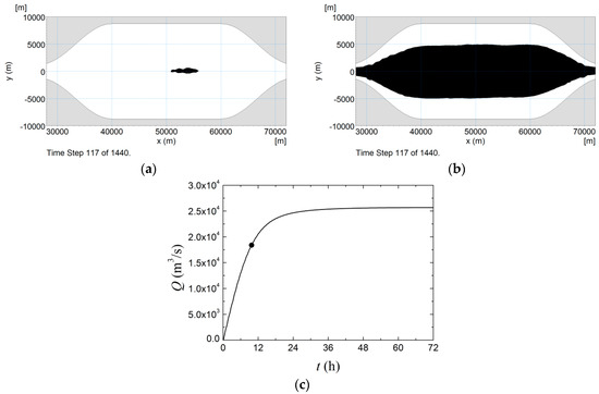 Wind-induced flow in: (a) a flow-through gulf; (b) a lake-like water body of the same bathymetry. The white region denotes flow in the direction of the wind and the black opposite to the wind. (c) Volumetric inflow into the gulf as a function of time. The dot denotes the time during the flow acceleration at which the return flow, depicted in (a), first appears.