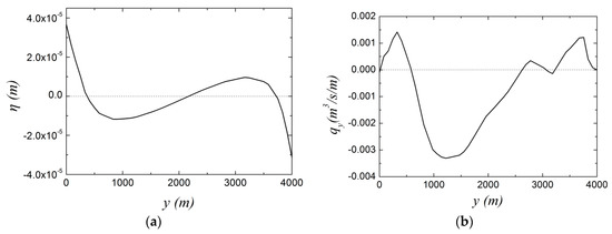 We now turn to a numerical simulation of a lake problem similar to the example discussed in the previous example. The shapes of the simulated cross-flow free-surface and the cross-flow flux that are presented in Figure 4 are to be compared with the respective shapes calculated analytically (Figure 3). It is noteworthy that, although the shape of the cross-flow free surface is excellent, the shape of the cross-flow flux is not, and the present writers have been unable to produce a more coherent curve, in spite of their efforts. A plausible reason for the discrepancy, besides the difficulty of simulating numerically weak second order effects, may be that the presence of seiches excites the nonlinearities of the problem, which are negligible when the seiches are absent. In spite of its non-smooth shape, the curve in Figure 4b presents the same basic features as the analytical curve in Figure 3b.