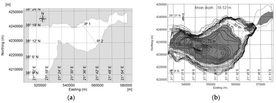 The wind-induced circulation in the Gulf of Patras, in Western Greece, has been studied using three-dimensional numerical simulations by [5]. Details of this application can be found in the original paper; here, we merely summarize pertinent details. The wider area of the Gulf, which served as the numerical domain of the simulations, is shown in Figure 5a. The Gulf proper is 40–50 km long, 10–20 km wide and 56 m in mean depth, approximately (Figure 5b).