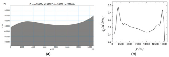 To give a dimensional example, for a lake having dimensions: = 30 km, b = 4.4 km and hmax = 40 m ( = 26.7 m), a 10-m/s wind blowing for 3 h, the value of has been chosen so that the above theory may be used. The scale, given by Equation (4), is 0.4 m3/s/m, and using Figure 3, the cross-wind flux is of the order of 4 m3/s/m. Although this flow may seem weak, it imposes an exchange flux between littoral and pelagic regions, which may transport dissolved constituents, e.g., nutrients, thereby affecting water quality in lacustrine systems, and it is at least comparable to fluxes induced, for example, by convective cooling of lakes (e.g., [10,11]).