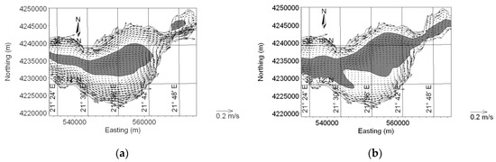 The part of the numerical domain where the local depth is larger than the mean depth is shown in Figure 5b. The steady state of the depth-averaged circulation in the Gulf induced by a 6-m/s westerly wind is shown in Figure 7, for two cases. In the panel case (Figure 7a), the Gulf functions as a flow-through gulf, i.e., as it actually is, while in the second (Figure 7b), it is artificially reduced to a lake (by numerically “closing” both of its ends). In the flow-through mode, strong nearshore currents, which had developed during the acceleration phase of the flow, can be observed to survive at steady state. The return flow is confined to the deeper region, compared to the “lake mode” of the same gulf, shown in the latter panel, which can be seen to be fairly well correlated with the deeper-than-mean-depth region in Figure 5b.