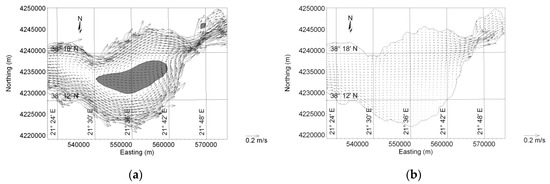 Finally, in order to demonstrate the great difference between the flow field developing under wind forcing, compared to the flow field due to the tide, we juxtapose, in Figure 8, a flow-field instant under the combined action of the wind and the tide, at quadratures (left panel) to the flow-field instant under the action of the tide alone. Again, the wind-induced circulation features are prominent, and this is so not only at quadratures, but also at the syzygies, when the tidal range is much larger (up to 40 cm) [12]. The reason is that tidal flow induces weak currents nearshore, as can be seen in Figure 8b, so that in the presence of the wind, the wind-induced currents prevail nearshore, giving rise to the same phenomenon.