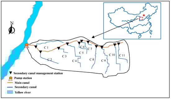 JMIS is in Yuncheng City, Shanxi Province, at a latitude of 35°00’–35°10’ N, longitude of 110°22’–110°51’ E, and elevation from 360–450 m. The irrigation scheme has a semi-arid climate condition, characterized by cold and dry winters, hot and rainy summers, and a mean annual precipitation of 500 mm. The main crops in JMIS are apple and cotton. Irrigation water is usually applied 4–6 times a year under surface irrigation. The irrigation water delivery system in JMIS consists of a pump station, management stations, control structures, a main canal, secondary canals, and tertiary canals, as shown in Figure 1. A total of 11 secondary canals were selected to evaluate the irrigation performance in 2012, 2014, and 2015. The characteristics of the selected secondary canals in this study area, such as the location, the irrigated area, the length of canal, and planting crop, are given in Table 1.