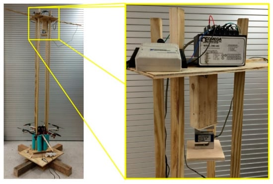 The endurance and total payload of the UAV were determined with indoor tests. A flight performance test station was developed to determine how long the UAV can fly while carrying a certain payload (Figure 2). The flight performance test station consisted of a wooden structure, a load cell (MR01, Honeywell, Morris Plains, NJ, USA), a data acquisition board (NI-USB-6009, National Instruments, Austin, TX, USA), and a bridge sensor (DMD 465, Omega Engineering, Norwalk, CT, USA). The test station was developed to place the UAV in the middle of the wooden columns to provide safe zone during the tests. The data acquisition board was used to transfer thrust measurements to a computer. Once the UAV was placed in the columns, it moved freely on the vertical axis. The load cell placed under the top cover of the station measured the force while the UAV was flying in the upward direction. Load cell was calibrated by converting real-time load values (g) into electrical signals (mV). The dynamic range of the load cell was 5–50 kg with an excitation voltage range of 5–10 V. The bridge sensor was integrated with the load cell for signal conditioning to amplify the full scale output voltage []. A regression equation was developed between the known weights and output voltages. The regression equation in the LabVIEW program then converted the output voltage into corresponding weight while the UAV was exerting force on the load cell in the upward direction.