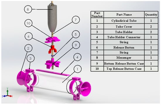 A thief-style water sampler [] was designed with SolidWorks® (Dassault Systèmes Americas Corp., Waltham, MA, USA) and fabricated. A thief sampler is typically an open tube used to sample containerized liquid water []. Designed parts were 3D-printed with a laser printer using Selective Laser Sintering (SLS) technique to fabricate the water capturing mechanism. The volumetric capacity of the sampling equipment was designed to be 130 mL. Figure 3 shows the FWCM. The FWCM consists of a cylindrical tube, tube covers, a release button, and a polymer plastic string. The length and diameter of the sampling tube were 15.24 and 3.81 cm, respectively. A polymer plastic tether was selected because of its strength and elasticity. This material provided enough tension to pull the covers back when the sampler was set. The plastic string closes the two open ends rapidly once the release button is pressed. The release button is pressed when the messenger (a metal weight) is released. Releasing the messenger and triggering the push button actions were achieved autonomously with the flight controller.
