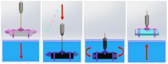 The developed UAV can fly autonomously using its autopilot function and automatically obtain altitude information from its sensors []. Therefore, the water sampler release action was controlled with autopilot commands. A “do-set-servo” command was added to the flight mission at a desired location and altitude. Once the UAV is in hovering pattern over the sampling location, the servo is triggered to release the water sampler into the waterbody to collect a water sample. With the weight of the collected water, the gross weight of the UAV was 2730 g (Table 2). The sequential procedure of the release of water sampler and messenger during water capturing is shown in Figure 4. The sequential water capturing procedure is made of four events. At first, the FWCM is set by opening both end covers and fixing the messenger under the UAV to the servo lock. When the UAV is arrived at the sampling location, the FWCM is dropped into the water as the first event. The second event is the messenger release from the UAV after 4 s of dropping the FWCM. Once the messenger is released, it dives into water and hits the triggering mechanism on the FWCM. The third event is the water capturing by closing the side covers. The two side covers are closed due to the stretched rubber string inside the cartridge. Once the side covers are closed, water is trapped inside the cartridge. The rubber string keeps the two side covers tight and prevents potential leakage. The final event of the sequence is the UAV take off and return to home location. A delay time of 9 s is assigned before messenger release event and before take-off event. A video showing the system operation can be found in Koparan [].
