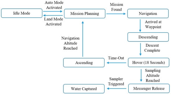 The schematic diagram of a UAV-assisted water sampling operation is shown in Figure 6. Individual autonomous flight missions were conducted for each water collection flights. The sampling mechanism was set, the flight controller and power unit were connected, the motors were armed, and the UAV was set to “idle mode” before each flight. In this mode, the UAV was ready to be launched by radio controller to start its mission. Next, “mission mode” was selected from the radio controller, and the flight controller searched for a preset mission. The throttle level was brought to 50% to provide enough thrust to start the mission. As soon as the motors started rotating at 50% throttle, the UAV ascended to the preset altitude and navigate to the predefined location. Once the UAV reached the sampling location, it descended to the sampling altitude and hovered for 18 s. During this time, the subsystem mounted on the UAV released the messenger weight to trigger the water sampler. After 18 s, water was captured and the UAV ascended to the navigation altitude to return to the launching location to complete the mission. An autonomous landing option was used to provide safe landing.