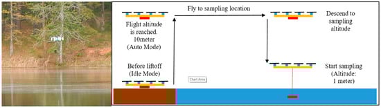 Shallow samples are generally collected from surface waters at a depth of 0–25 cm or from the surface, and deep samples are taken from surface waters at a depth of more than 100 cm []. The water sampler was suspended from the UAV with a 1.8-m-long tether. Once the approximate altitude of the UAV was determined from the flight controller, sampling depth was estimated by calculating the difference between the tether length and the altitude of the UAV during water sampling. The altitude data collection was made while flying the UAV autonomously during a water sampling mission (Figure 7).