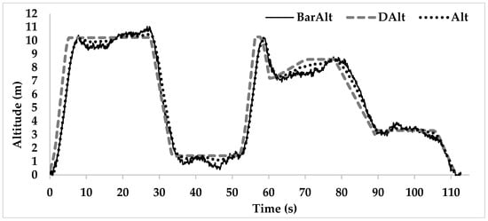 The altitude data was retrieved from the flight controller using the MAVLink protocol []. The control tuning (CTUN) registrar is where the altitude information of autonomous flights are stored in the flight controller []. CTUN registrar information includes the barometer altitude (BarAlt), the desired altitude (DAlt), and the inertial navigation altitude estimate (Alt) that is driven from filtering algorithms []. The filtering algorithms are used to estimate the position, velocity and angular orientation based on gyroscope, accelerometer, compass, GPS, airspeed, and barometric pressure [,]. Therefore, the autonomous navigation and the altitude estimations of the UAV were dependent on all the sensor inputs and filtering algorithm. Because the altitude of the UAV was dependent on the listed sensors and filtering algorithms, their individual altitude outputs from the UAV were similar (Figure 8). Since an approximate altitude was needed for this study, only the barometer altitude outputs were used to estimate the sampling depth.