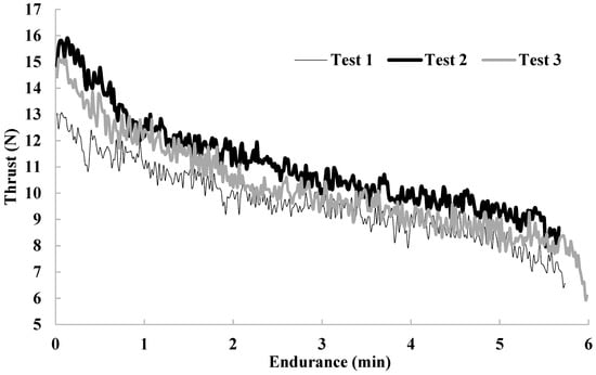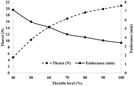 As external forces affect basic motions of the UAV, it was decided to measure the actual thrust that the UAV could produce with indoor laboratory tests. The change in thrust and endurance were recorded at throttle levels from 40 to 100%. Figure 9 shows the change in thrust over time while operating the UAV at 50% throttle. The averages of the thrust and endurance at each throttle level were calculated and used to develop the flight performance chart (Figure 10). Indoor flight performance test results showed that, when throttle level increased, the produced thrust also increased while endurance decreased. Total weight of the UAV with payload was 2730 g (Table 2). Therefore, the UAV must be able to produce enough thrust for liftoff with a minimum of 2730 g of weight. In addition to the total weight of the UAV, at 50% throttle, the UAV was able to produce an additional 10.3 N of thrust in lab conditions. These test results proved that the UAV could fly autonomously for 5.79 min when the throttle level for autonomous flight was set at 50%.