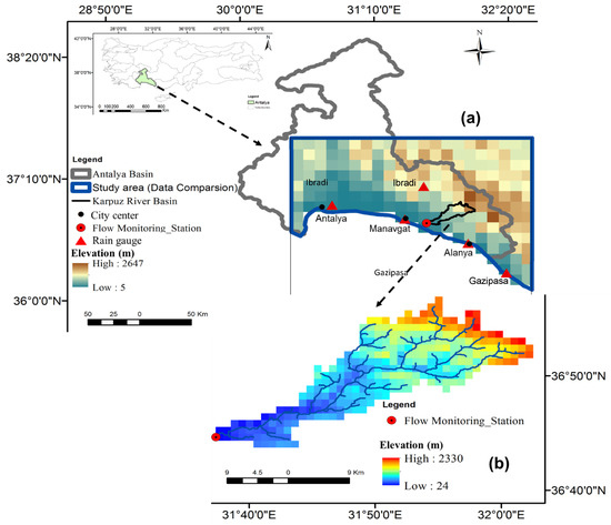 The study area selected for the comparison between GSMaP and rain gauge data (a), Karpuz River basin and the digital elevation model (DEM) at 1 km × 1 km spatial resolution grids matching the hydrologic model resolution (b).