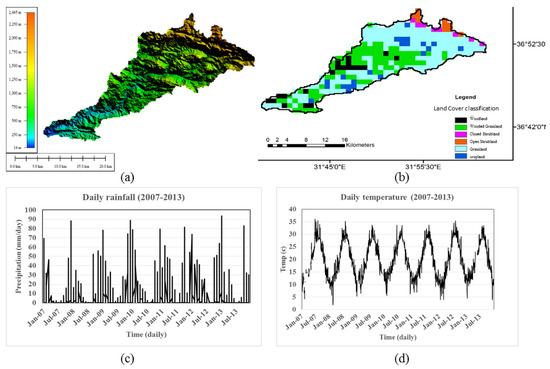 Topography of the study area based on ASTER Global DEM (a), Land cover classification obtained from AVHRR satellite data (b), daily precipitation data (c), and daily air temperature (°C) data (d).