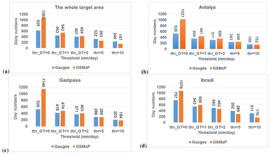 Numbers of rainy days were estimated for the time period from 2007 to 2013 above selected threshold for (a) the whole study area (average), (b) Antalya rain gauge station (Elevation: 50 m), (c) Gazipasa rain gauge station (Elevation: 21 m), and (d) Ibradi rain gauge station (Elevation: 1036 m).