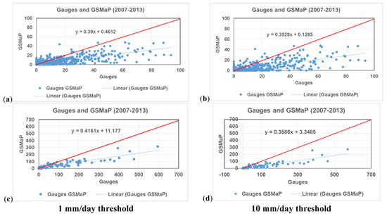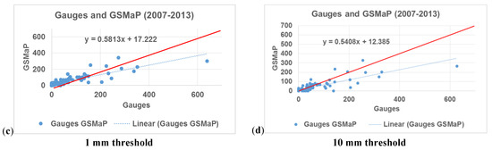 Scatterplots of (a,b) daily, and (c,d) monthly precipitation between GSMaP and rain gauges for the period 2007–2013. Precipitation threshold set to 1 mm/day (left column), and 10 mm/day (right column).