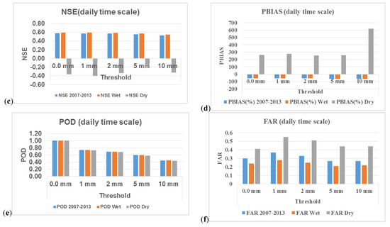 GSMaP product and rain gauge dataset were spatially averaged over the whole study area and compared using scatterplots (Figure 4) and statistical measures (Figure 5). The analysis was performed using two rainfall intensity thresholds—a 1 mm/day threshold due to discussion provided in the previous section and a 10 mm/day threshold to investigate GSMaP performance for high rainfall events. The results indicate that most of the scenarios investigated exhibit an underestimation by GSMaP. For instance, at the daily time scale, the correlation between GSMaP and rain gauge data are over 0.65 and 0.60, respectively. However negative PBIAS value is evident for the whole time series and wet seasons, but positive values are observed for the dry seasons, or low rainfall periods. This indicates that GSMaP has a general tendency to underestimate precipitation with an exception of dry-season overestimation tendency, which is possibly due to reporting of non-realistic low-rainfall occurrences as discussed during our earlier analysis (see Figure 3 and Figure 4). The average PBIAS is about negative 56% at the daily time scale and about negative 48% at both monthly and annual time scales. Most of the statistics for monthly and annual scales show similar trends as daily timescale, except with increasing RMSE values due to the time scale differences. Note that the results for area-averaged analysis for the thresholds (0 mm, 1 mm, 2 mm) are similar; the reason being due to the GSMaP having the tendency to underestimate. GSMaP, however, frequently reports unrealisticly low rainfall which in the overall average could give the same statistics in comparison with rain gauges for the low threshold values (from 0 mm to 2 mm). As noted earlier, consideration of less than 1 mm/day rainfall intensities for the bias correction will mislead to unrealistic events and hence it is not recommended. Consequently, our results indicate that 1 mm/day threshold (or in some cases 2 mm/day) is a reasonable choice for the following reasons: (1) The number of days with rainfall occurrence is similar between the rain gauges and GSMaP data above these thresholds (Figure 3), and (2) low rainfall values that might lead to high uncertainty in case of bias correction are eliminated. Analysis of categorical measures (Figure 5) indicate that rainfall detection capacity of the GSMaP deteriorates as the rainfall intensity increases, accompanied by slight reduction (better) in false alarm rate.