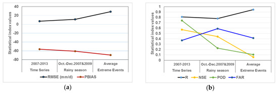 Analysis of statistical measures for GSMaP and rain gauge daily precipitation considering the whole time series, rainy season from October to December in 2007 and 2009, and average for three extreme flash floods events, (a) RMSE, and PBIAS, (b) R, NSE, POD, FAR (1 mm/day threshold is considered in this comparison).