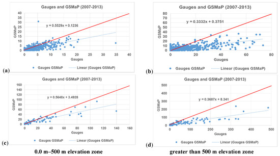 Scatterplots of (a,b) daily and (c,d) monthly precipitation between GSMaP and rain gauges for the period 2007–2013 for 0 m–500 m elevation zone (left column) and for >500 m elevation zone (right column).