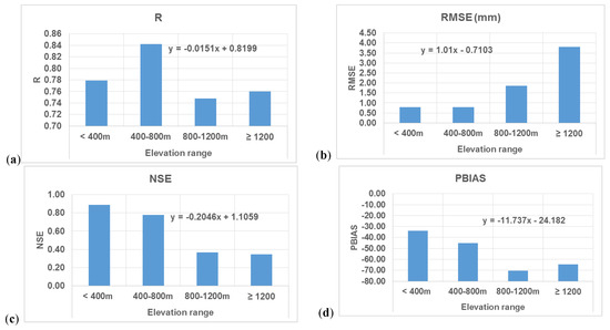 Statistical and categorical measures showing the GSMaP performance (daily time scale) as a function of elevation. Elevation zones are (<400 m), (400 m–800 m), (800 m–1200 m), and (≥1200 m). Measures include R, RMSE, NSE, PBIAS, and POD (a–e), respectively.
