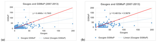Improvement of GSMaP data compared to the rain gauge data after bias correction using different thresholds, (a) 1 mm/day, and (b) 2 mm/day.