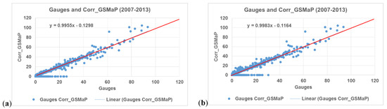 Figure 11 exhibits the spatial distribution of GSMaP product before and after the bias correction procedure for the day of 4 November 2009. Note that the magnitude of the rainfall for the corrected GSMaP is similar to the rain gauges, while the spatial distribution is similar to the original GSMaP product. For the maps shown in Figure 11, the average rainfall values for GSMaP data was improved from 12.27 mm/day to 30.73 mm/day after correction which closely matches the average rainfall obtained from the rain gauges (33.27 mm/day).