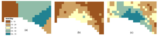 Spatial distribution of daily rainfall data for the date 2009-11-04, obtained from (a) rain gauges, (b) GSMaP, and (c) corrected GSMaP.