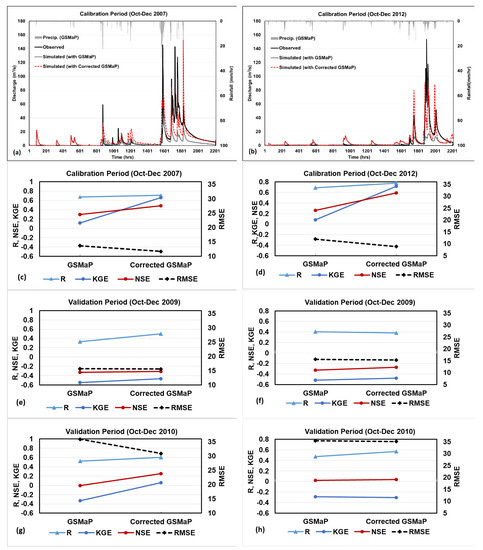 Although the model performance improvement during the calibration period is important to assess the influence of the GSMaP bias correction on the model simulation, the model performance assessment during evaluation period is another crucial step. For example, Figure 12 shows the performance statistics during validation period, namely October–December 2009 and October–December 2010, respectively, for the model calibrated to the October–December 2007 period. Figure 12f,h shows the same information but for the model calibrated to the October–December 2012 period. It can be seen from these figures that the model performance significantly deteriorates during the validation period compared to the calibration period. Among the four validation cases tested, only one case (Figure 12g) revealed noticeable improvement in model performance upon using corrected GSMaP instead of GSMaP to drive the hydrological model. In this case, R, KGE, NSE and RMSE statistics changed from 0.52, −0.33, 0.01, 35.89 to 0.60, 0.06, 0.26 and 30.92 upon using the corrected GSMaP. In other validation cases tested, statistical measures either slightly improved or did not change when using the corrected GSMaP instead of GSMaP. The generally poor performance behavior of the model during the validation period is likely due to a combination of factors including short calibration period, inherent errors in precipitation measurements (especially for flash floods with a scarce gauge network) and satellite-based precipitation products, and limitations in the bias correction procedure utilized.